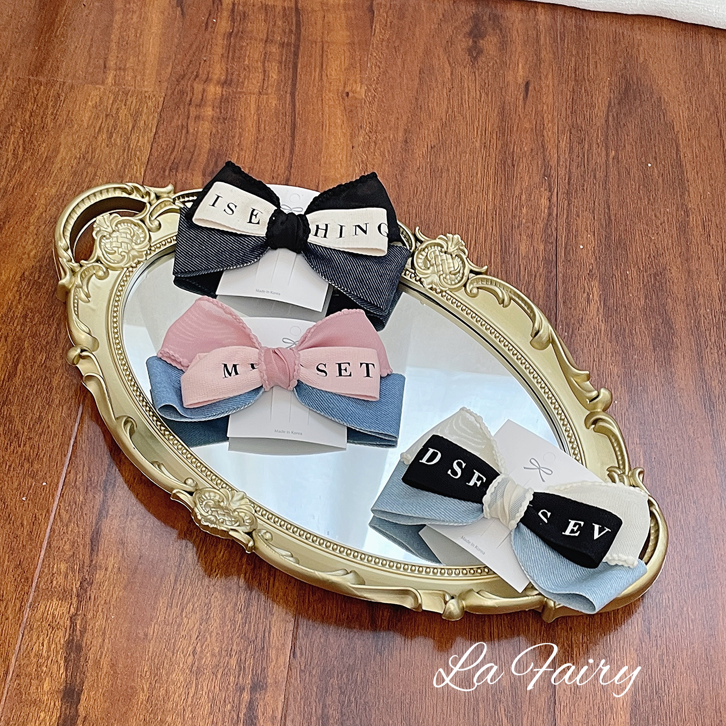 獨家設計款-限量韓國製手工牛仔撞色英文字緞帶立體蝴蝶結髮夾