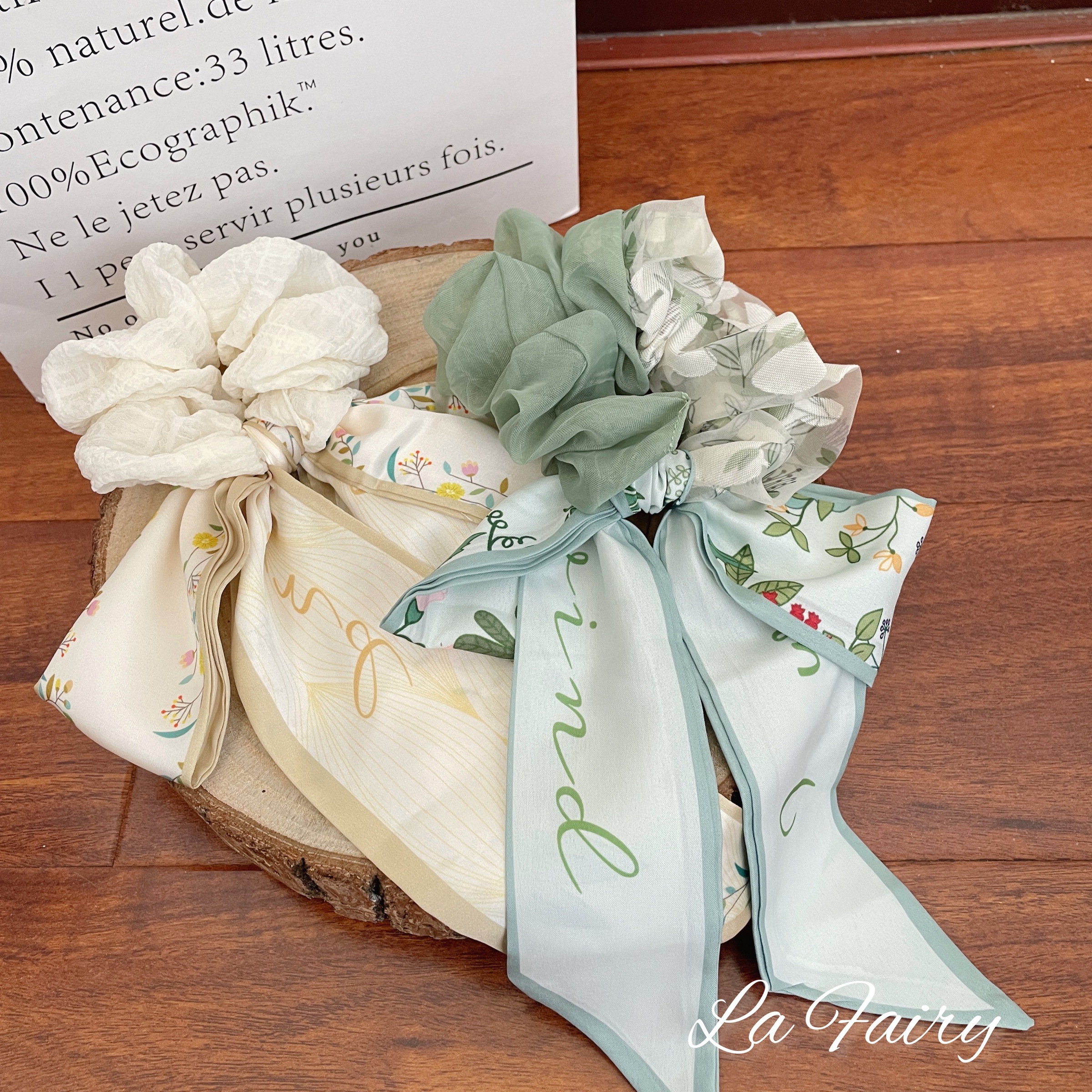 獨家設計款-限量韓國製手工慵懶印花緞帶飄帶雪紡紗大腸髮圈